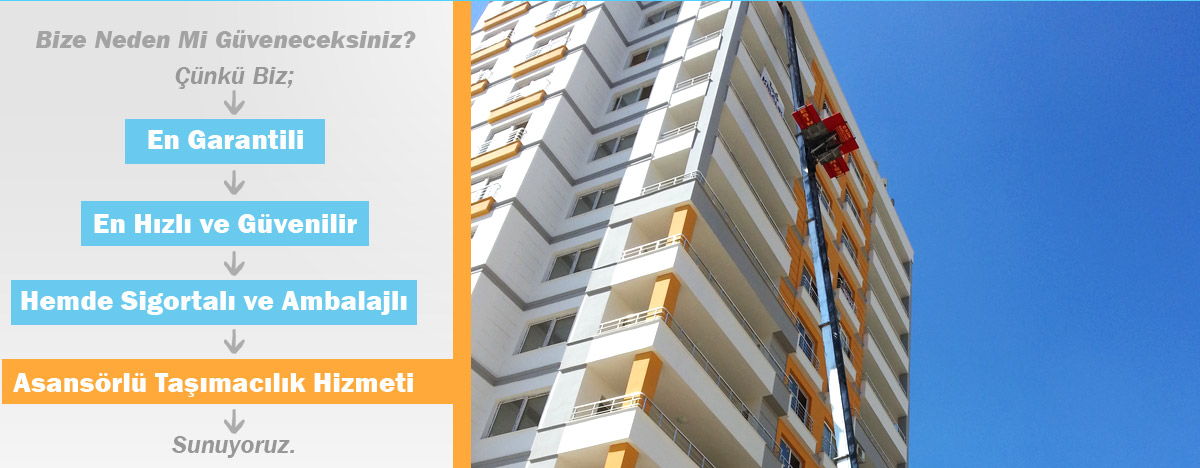Gaziantep Asansörlü taşımacılık sistemimizden faydalanmak için firmamızı 2 iş günü içerisinde aramanız halinde şirket sorumlumuz bulunduğunuz yere eksper göndererek taşınacağınız ev eşyalarını, asansör kurma sistemini inceler ve anlaşma yapılması taktirinde iki taraflı sözleşme imzalamaktadır. Asansörlerimiz 21 kata kadar çıkabilen hidrolik ve otomatik asansör sistemidir. Eşyalar pencere veya balkon aracılığı ile taşınmaktadır. Asansörlerimizin bakımı işinde uzman personellerimiz aracılığı ile yapılmaktadır.